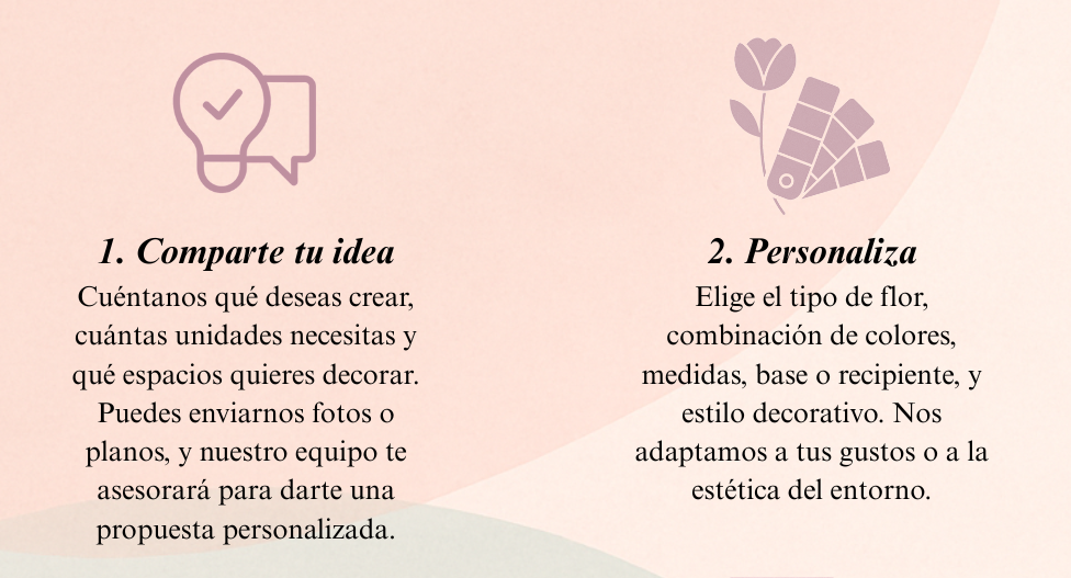 En Flores Preservadas Primavera trabajamos contigo para crear composiciones florales únicas, adaptadas a tus necesidades. Ya sea un centro decorativo para un hotel, una pieza a medida para un restaurante o una selección especial para tu tienda, te ayudamos a elegir los materiales, colores y formatos ideales.